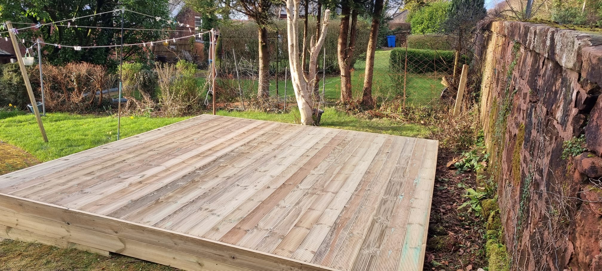 - Timber Decking – Prefer the natural look? We use treated timber boards built to last. Timber decking offers classic charm with strong underfoot feel, and we apply protective treatments to extend its lifespan.